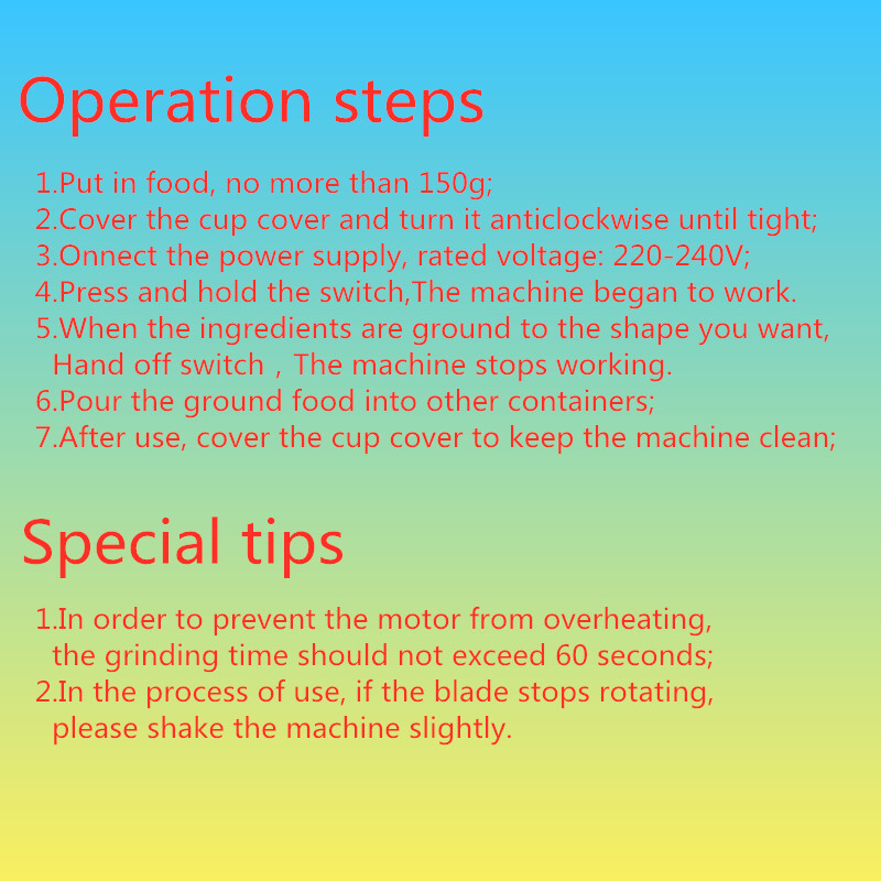 1.In order to prevent the motor from overheating,the grinding time should not exceed 60 seconds;