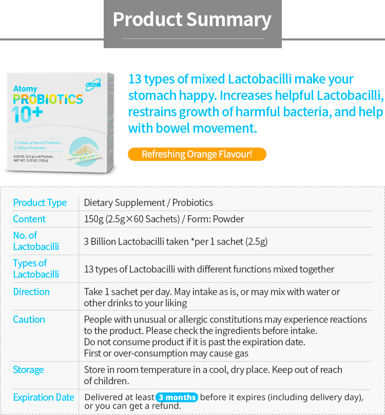 12 types of mixed Lactobailli make your stomach happy. Increases helpfful Lactobacilli, restrains growth of harmful bacteria and help with bowel movement.