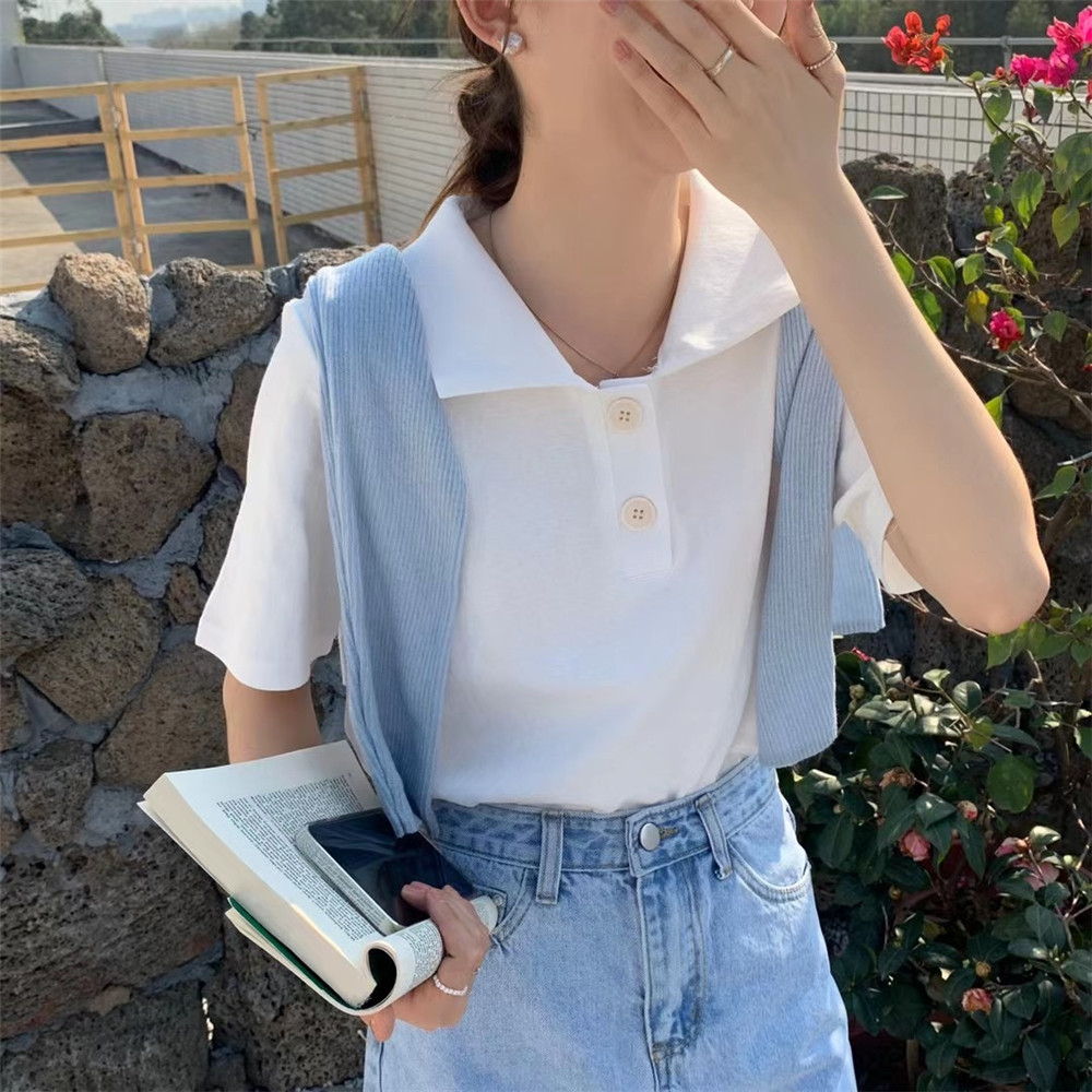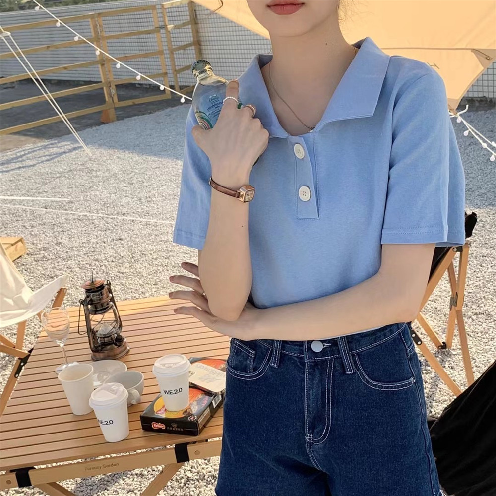 Women Clothing New Retro Pure Color All-match Short-sleeved Lapel Polo T-shirt