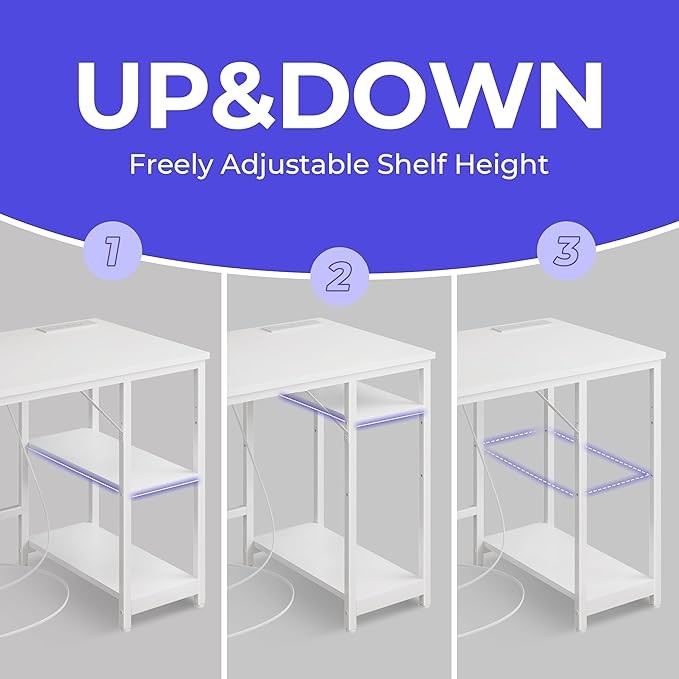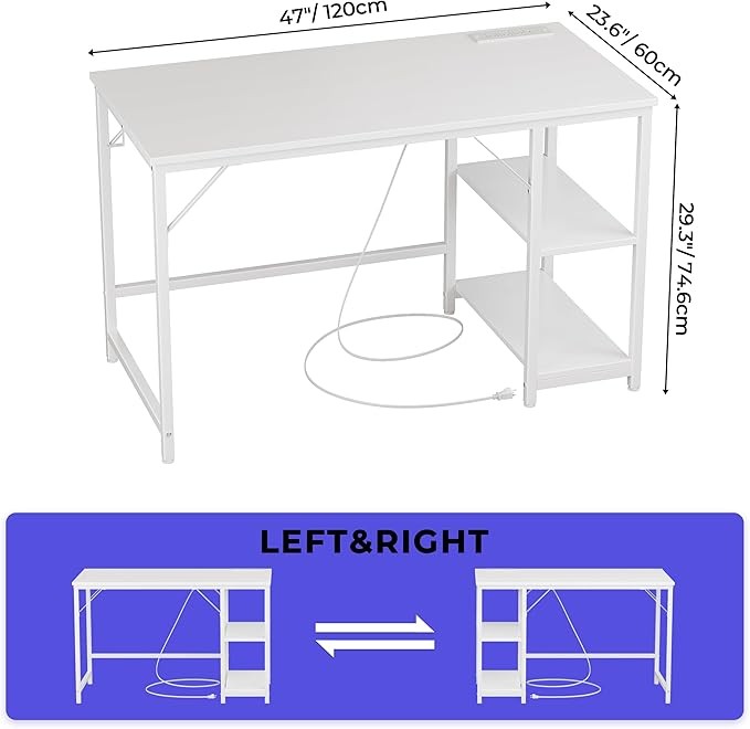 • 【Reversible Storage Rack】 The home office desk features a reversible storage rack that can be installed on either side, with adjustable gradients on the uppermost shelf for various item sizes, making it a versatile white table.